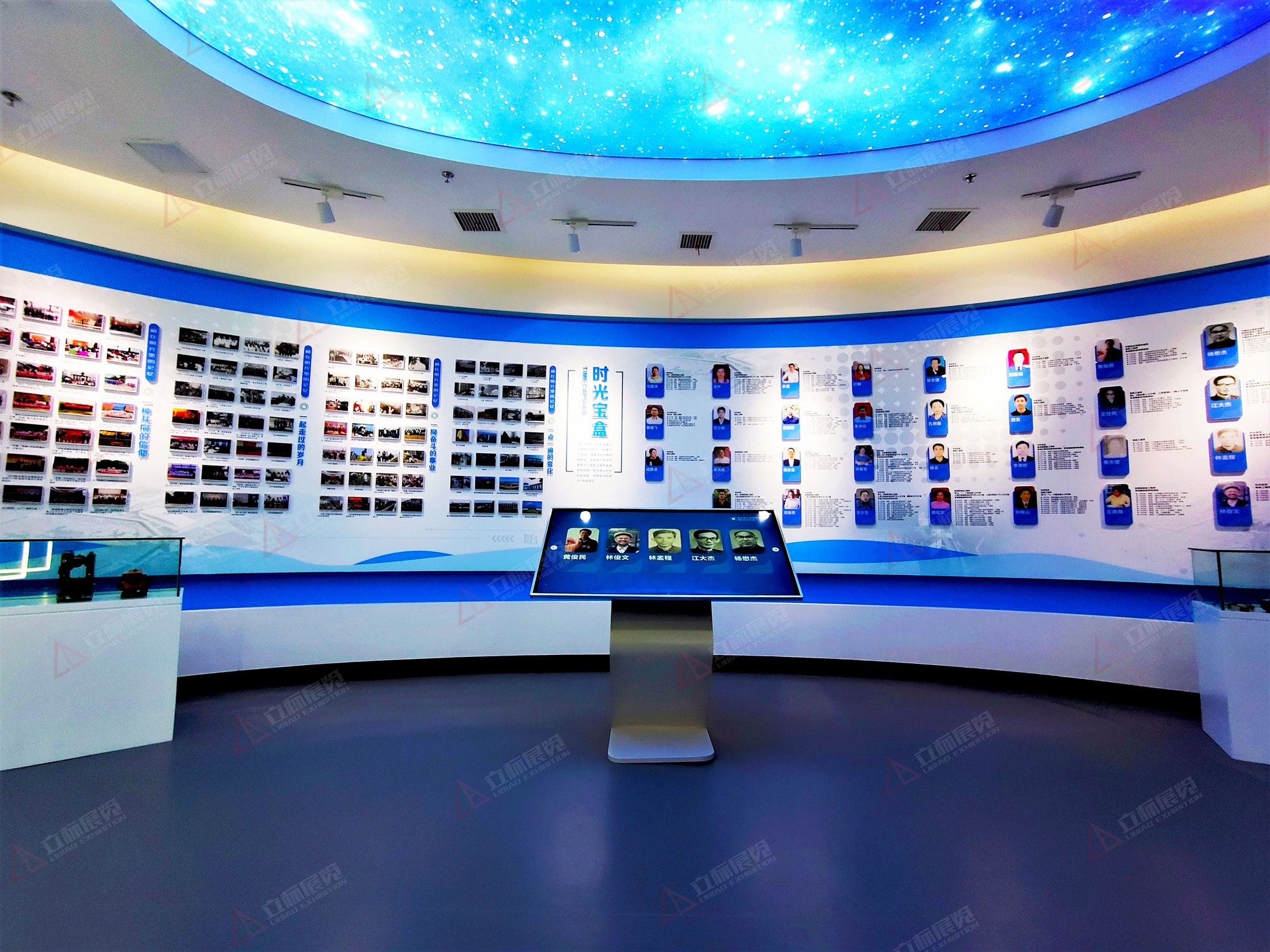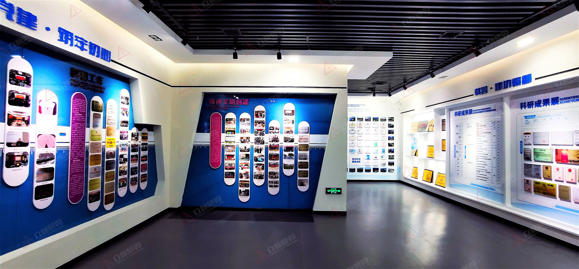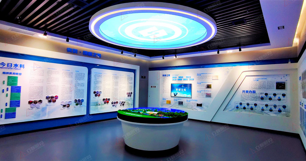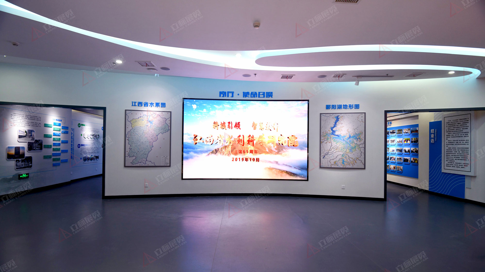 展館突出“水”元素,強(qiáng)化“水”主題,展現(xiàn)“水”文化特色,設(shè)計元素契合水科院文化特色綜合運(yùn)用聲光電,結(jié)合投影、場景裝置以及互動裝置等,展示形式多樣化豐富天花、地面、界面的色調(diào)、造型表現(xiàn),各個版塊空間的調(diào)性有所區(qū)分,使小空間的主題演繹異彩紛呈,使觀展節(jié)奏更加張弛有度。